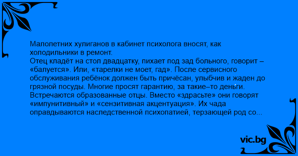 Встречаются образованные отцы. Вместо «здрасьте» они говорят «импунитивный» и «сензитивная акцентуация». Их чада оправдываются наследственной психопатией, терзающей род со времён Кощея Бессмертного. Для сравнения, просто дети бренность стекла связывают со злым роком и нелепым случаем.