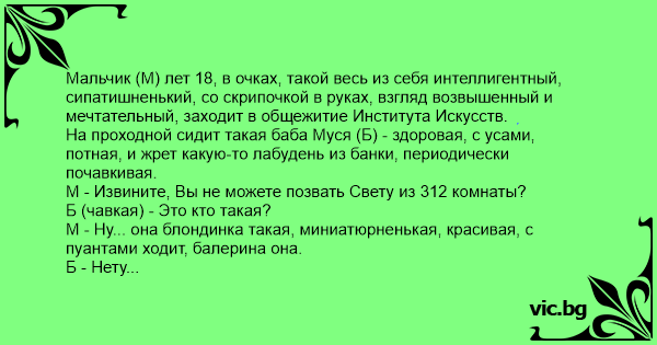 Б - (облизывая алюминиевую ложку, заканчивая обед) - Не знаю. Балет уехал на гастроли. Ебите хор.