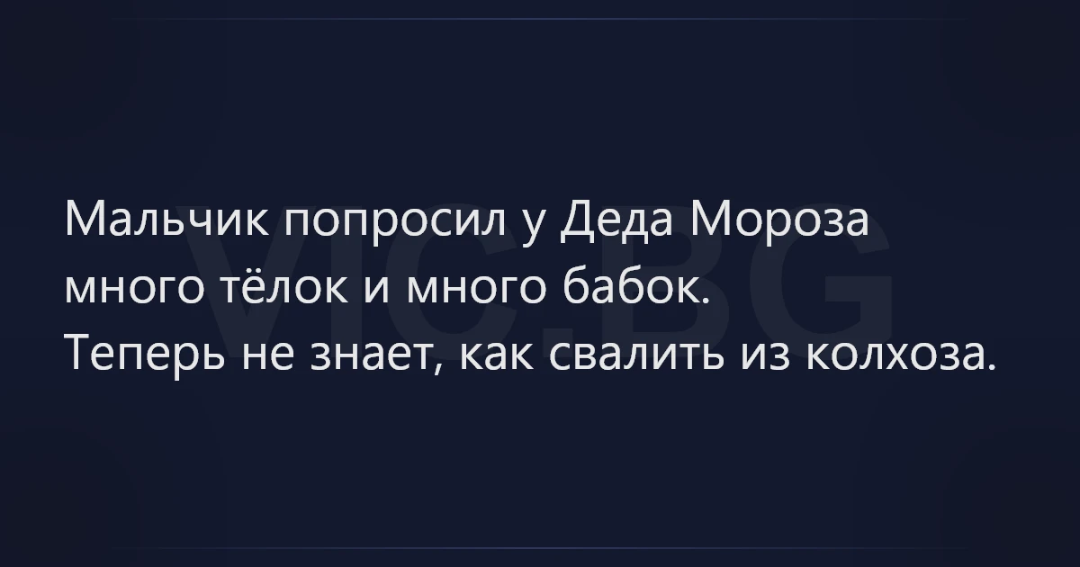 Мальчик попросил у Деда Мороза много тёлок и много бабок. Теперь не знает, как свалить из колхоза. 25 0 0 Анекдоты