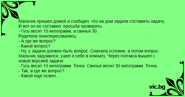 Мальчик пришел домой и сообщил, что на дом задали составить задачу. И вот он ее составил, просьба проверить.