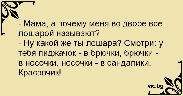 - Ну какой же ты лошара? Смотри: у тебя пиджачок - в брючки, брючки - в носочки, носочки - в сандалики. Красавчик!