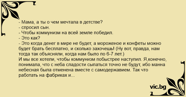 - Это когда денег в мире не будет, а мороженое и конфеты можно будет брать бесплатно, и сколько захочешь! (Ну вот, правда, нам тогда так объясняли, когда нам было по 6-7 лет.)