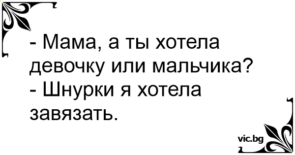 - Мама, а ты хотела мальчика или девочку? - Вообще-то, я хотела шнурки завязать.