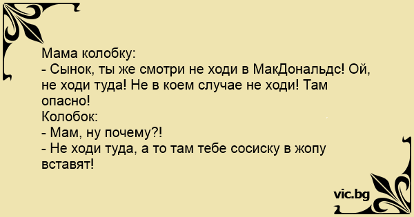 Мама колобку:<br />- Сынок, ты же смотри не ходи в МакДональдс! Ой, не ходи туда! Не в коем случае не ходи! Там опасно!<br />Колобок:<br />- Мам, ну почему?!<br />- Не ходи туда, а то там тебе сосиску в жопу вставят!