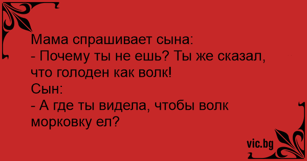 - Чому ти не їси? Ти ж сказав, що голодний як вовк! - А де ти бачила, щоб вовк морквину їв?