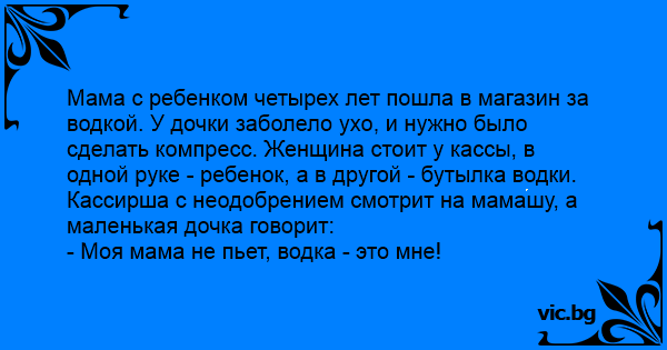 Мама с ребенком четырех лет пошла в магазин за водкой. У дочки заболело ухо, и нужно было сделать компресс. Женщина стоит у кассы, в одной руке - ребенок, а в другой - бутылка водки. Кассирша с неодобрением смотрит на мамашу, а маленькая дочка говорит:
