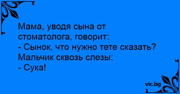 Майка извеждайки сина си от кабинета на зъболекарката казва: - Синко, какво трябва да кажеш на леличката?