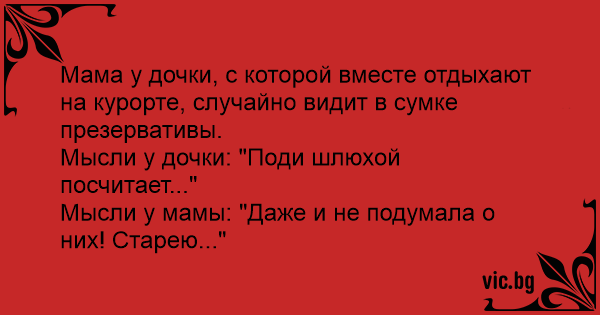 Мама у дочки, с которой вместе отдыхают на курорте, случайно видит в сумке презервативы. Мысли у дочки: "Поди шлюхой посчитает..." Мысли у мамы: "Даже и не подумала о них! Старею..."