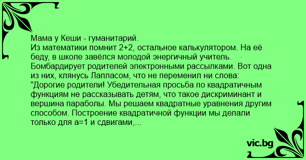 Из математики помнит 2+2, остальное калькулятором. На её беду, в школе завёлся молодой энергичный учитель. Бомбардирует родителей электронными рассылками. Вот одна из них, клянусь Лапласом, что не переменил ни слова: