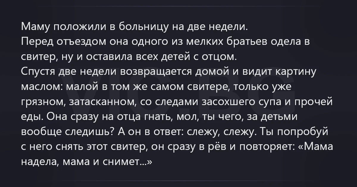 Маму положили в больницу на две недели. Перед отъездом она одного из мелких братьев одела в свитер, ну и оставила всех детей с отцом. Спустя две недели возвращается домой и видит картину маслом: малой в том же самом свитере, только уже грязном, затасканном, со следами засохшего супа и прочей еды. Она сразу на отца гнать, мол, ты чего, за детьми вообще следишь? А он в ответ: слежу, слежу. Ты попробуй с него снять этот свитер, он сразу в рёв и повторяет: «Мама надела, мама и снимет...»