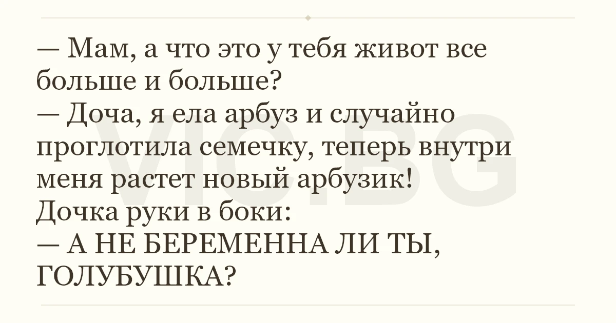 — Мам, а что это у тебя живот все больше и больше? — Доча, я ела арбуз и случайно проглотила семечку, теперь внутри меня растет новый арбузик! Дочка руки в боки: — А НЕ БЕРЕМЕННА ЛИ ТЫ, ГОЛУБУШКА?