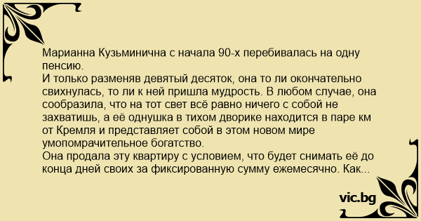Она продала эту квартиру с условием, что будет снимать её до конца дней своих за фиксированную сумму ежемесячно. Как только деньги капнули на её счёт, Марианна Кузьминична отправилась исполнять заветную мечту всей своей жизни. С большой дачной тележкой на колёсиках, в ближайший супермаркет. Она была большая охотница кормить голубей.