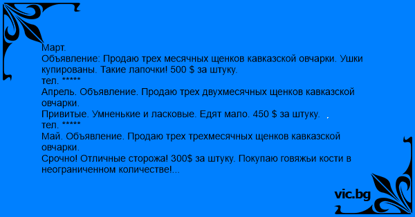 Апрель. Объявление. Продаю трех двухмесячных щенков кавказской овчарки.