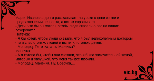 - Молодец, Манечка. Ну, Вовочка, а ты чтобы хотел услышать на своих похоронах?