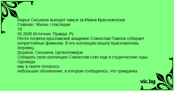 19. 05.2006 Источник: Правда. Ру Почти полвека ярославский академик Станислав Павлов собирает непристойные фамилии. В его коллекцию вошли Красножопова, Херовец, Дураков, Сиськина, Целколомидзе. Собирать свою коллекцию Станислав стал еще в студенческие годы. Однажды ему в газете попалось небольшое объявление, в котором сообщалось, что гражданка Красножопова подала на развод и расторгает свой брак с гражданином Красножоповым. "Меня тогда поразила сила любви и самоотверженность этой гражданки, - смеется Павлов. - Она не только вышла замуж за человека с такой неблагозвучной фамилией, но еще и его фамилию взяла". Такое смешное объявление Станислав вырезал и наклеил в тетрадь. Со временем туда вошли более сорока фамилий, напоминающих бранные слова. Большую часть собрания составляют фамилии студентов МГУ, где в то время обучался Павлов. Станислав с удовольствием внес в список Эмилию Бздак. Преподаватели лучшего вуза страны, повидавшие на своем веку многое, никак не могли произнести на семинарских занятиях ее фамилию, так как аудитория сразу настраивалась на несерьезный лад. По общей договоренности, милую девушку называли только по имени. Сама Эмилия каждый день клялась, что сменит фамилию. И это действительно произошло после того, как, отучившись, она благополучно вышла замуж. Следующим "экспонатом" коллекции стал однокурсник Йобст. Само написание фамилии было вполне допустимым и подцензурным. А вот произнести ее, тем более быстро и не вызвая при этом неприличных ассоциаций с известными междометиями русского языка, было трудно. Хитроумные педагоги и тут нашли выход - спорную фамилию произносили с медленным, прибалтийским распевом: И-Й-о-о-бст. Каждую фамилию в коллекции Станислав подтверждал документально, иначе могли не поверить, что она на самом деле существует. Для этого ему часто приходилось срывать с доски объявлений экзаменационные списки студентов, а также приказы о взысканиях и поощрениях. Секретарши часто жаловались на "злодея", но вычислить его так и не смогли. После окончания московского университета Станислав вернулся в родной Ярославль. Начал работать в известном Институте мономеров синтетического каучука. О своей секретной тетрадке вспомнил, когда на глаза ему попалось очередное объявление о разводе. Гражданка Херовец сообщала, что расторгает брак с гражданином Херовцом. Эта фамилия, конечно же, стала украшением коллекции Павлова. Узнав о необычном увлечении Станислава, друзья и знакомые стали присылать ему газетные вырезки с необычными фамилиями. Благодаря их стараниям коллекция пополнилась грузинским спортсменом Целколомидзе. Необычную историю о смене фамилии Павлову рассказал его отец. Сразу после гражданской войны в газетах целые столбцы были посвящены людям, менявшим фамилии. Оказывается, те "экземпляры", которые вошли в коллекцию Станислава, были куда пристойнее, чем родовые имена, от которых торопились освободиться в двадцатые годы. В царские времена фамилии крестьянам и обывателям, а также и купцам, часто записывались по прозвищам. "А прозвища, сами понимаете, не всегда блистали целомудрием и добронравием, - рассказывает Станислав. - Дураковы или Сиськины - не самый ужасный вариант для русской деревни, где люди годами разговаривали матом. Сменить же фамилию было весьма затруднительно". Купец Краснобрюхо