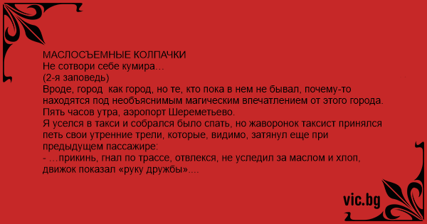 - А я, дуpak, вам тут про маслосъемные колпачки… Извините.