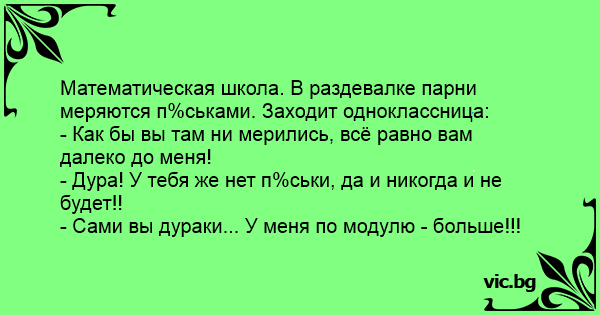 Математическая школа. В раздевалке парни меряются п%cьками. Заходит одноклассница:
