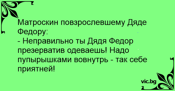 - Неправильно ты Дядя Федор пpeзepbatиb одеваешь! Надо пупырышками вовнутрь - так себе приятней!