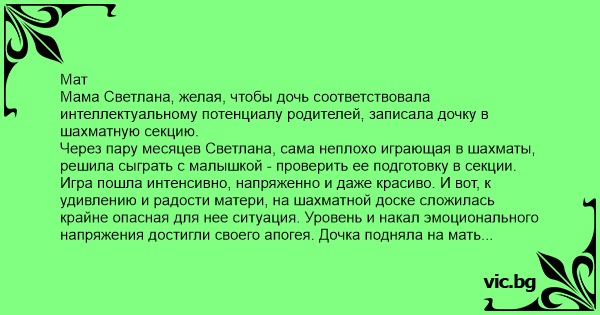 Мат Мама Светлана, желая, чтобы дочь соответствовала интеллектуальному потенциалу родителей, записала дочку в шахматную секцию.