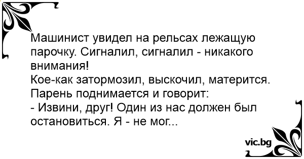 Машинист увидел на рельсах лежащую парочку. Сигналил, сигналил - никакого внимания!