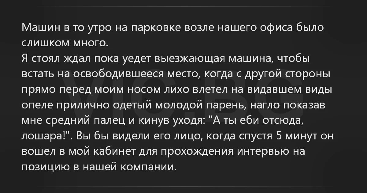 Машин в то утро на парковке возле нашего офиса было слишком много. Я стоял ждал пока уедет выезжающая машина, чтобы встать на освободившееся место, когда с другой стороны прямо перед моим носом лихо влетел на видавшем виды опеле прилично одетый молодой парень, нагло показав мне средний палец и кинув уходя: "А ты eби отсюда, лошара!". Вы бы видели его лицо, когда спустя 5 минут он вошел в мой кабинет для прохождения интервью на позицию в нашей компании.