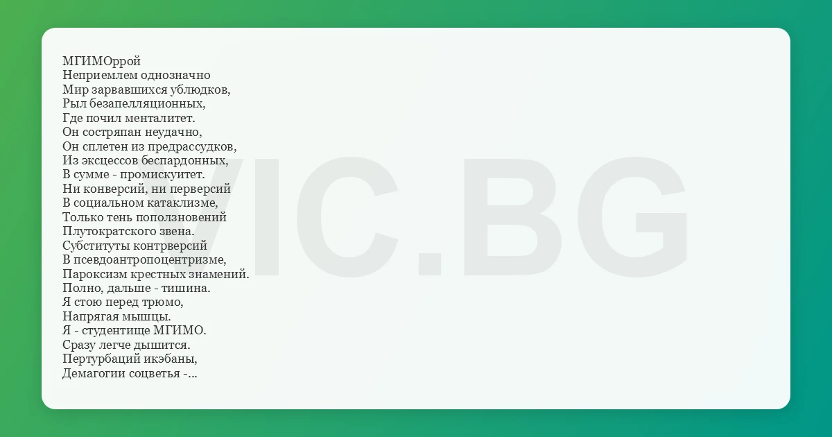 МГИМОррой Неприемлем однозначно Мир зарвавшихся ублюдков, Рыл безапелляционных, Где почил менталитет. Он состряпан неудачно, Он сплетен из предрассудков, Из эксцессов беспардонных, В сумме - промискуитет. Ни конверсий, ни перверсий В социальном катаклизме, Только тень поползновений Плутократского звена. Субституты контрверсий В псевдоантропоцентризме, Пароксизм крестных знамений. Полно, дальше - тишина. Я стою перед трюмо, Напрягая мышцы. Я - студентище МГИМО. Сразу легче дышится. Пертурбаций икэбаны, Демагогии соцветья - Квинтэссенция упадка. В совокупности - дурдом. Паханов хапужьи кланы - Горький привкус лихолетья. Безупречность беспорядка, Пиетет перед дерьмом. Я врубаю сериал, Где мирских страстей накал, Где богатенькие плачут И Расеюшку дурачат. Напрягаю бицепс, Распрягаю трицепс. Одиозен откровенно Парвеню эЛДэПээРа, Элитарен недоучка, Квазиультраэрудит. Лжет и врет попеременно Патриот эСэСэСэРа. Тот страну довел до ручки, Кто за ним сейчас стоит. Дело не в эЛДэПэРе, Сложность не в эСэСэРе, И не в том, что ГэДээРом Нынче правит Шредер-гад. Просто надо плюнуть гадам В морду жеваной морковкой. А самим заняться телом - Как своим, так и чужим. Жуйте, люди, геркулес, Набирайте лишний вес, Становитесь у трюмо, Поступайте во МГИМО.