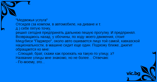 Отсидев (за компом, в автомобиле, на диване и т. д.) себе пятую точку, решил сегодня предпринять дальнюю пешую прогулку. И предпринял. Возвращаюсь назад, у обочины, по ходу моего движения, стоит Мицубиси "Паджеро", около авто ошивается лицо той самой, кавказской национальности, в машине сидит еще один. Подхожу ближе, джигит обращается ко мне: - Слющай, брат, скажи как проехать на такую-то улицу, э? Название улицы мне знакомо, но не более... Отвечаю: - По-моему, это за мостом, на той стороне... Ты доедь сейчас до перекрестка (показываю рукой направление) там гаишник стоит (видел, когда шел "оттуда"), так ты у него спроси, он наверняка знает". Абрек говорит: "Спасибо", я отвечаю: "Не за что", дитя гор садится в джип и уезжает, я неторопливо иду в том же направлении... Через минут 10 подхожу к тому самому перекрестку и вижу как водителя, пассажира и сам джип шмонают по полной программе... Посоветовал...