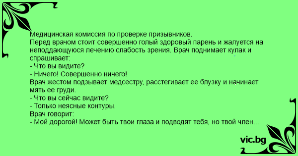 Перед врачом стоит совершенно голый здоровый парень и жалуется на неподдающуюся лечению слабость зрения. Врач поднимает кулак и спрашивает: