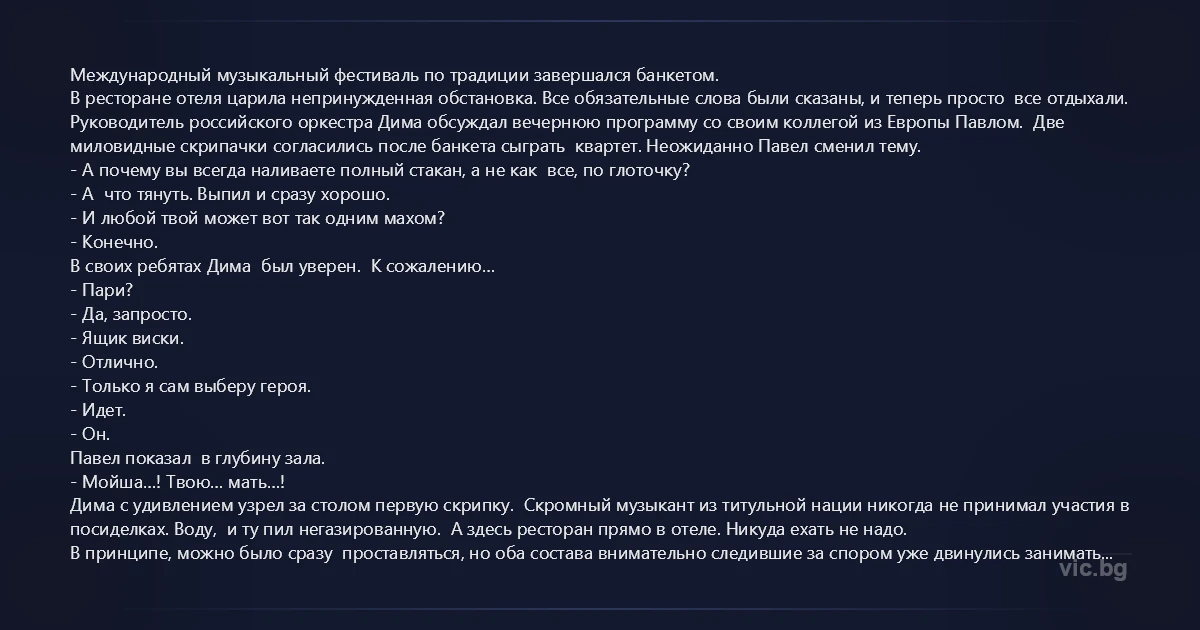 В ресторане отеля царила непринужденная обстановка. Все обязательные слова были сказаны, и теперь просто все отдыхали. Руководитель российского оркестра Дима обсуждал вечернюю программу со своим коллегой из Европы Павлом. Две миловидные скрипачки согласились после банкета сыграть квартет. Неожиданно Павел сменил тему.