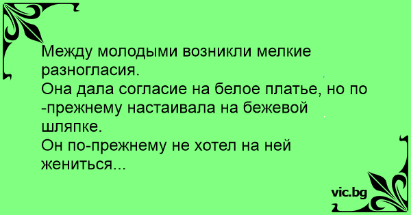Между младите възникнаха някои малки разногласия. Тя се съгласи на бяла рокля, но настояваше за бежова шапцица. Той, както и преди, не искаше да се жени