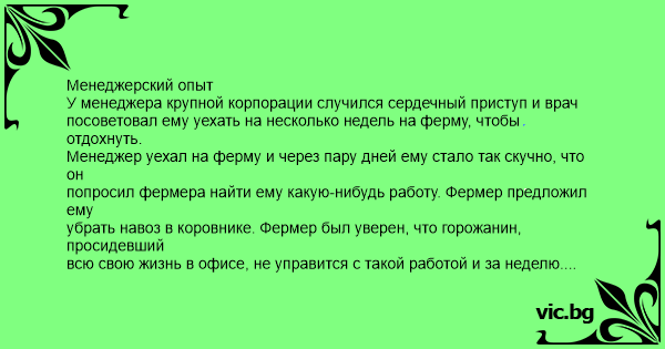 Менеджерский опыт У менеджера крупной корпорации случился сердечный приступ и врач посоветовал ему уехать на несколько недель на ферму, чтобы отдохнуть.