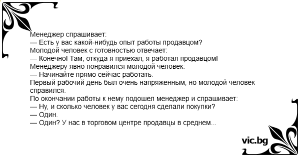 — Есть у вас какой-нибудь опыт работы продавцом?