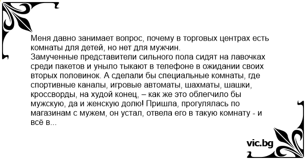 Меня давно занимает вопрос, почему в торговых центрах есть комнаты для детей, но нет для мужчин. Замученные представители сильного пола сидят на лавочках среди пакетов и уныло тыкают в телефоне в ожидании своих вторых половинок. А сделали бы специальные комнаты, где спортивные каналы, игровые автоматы, шахматы, шашки, кроссворды, на худой конец, – как же это облегчило бы мужскую, да и женскую долю! Пришла, прогулялась по магазинам с мужем, он устал, отвела его в такую комнату - и всё в порядке, вечером никто не будет ворчать на тему «ну чего так долго», все прекрасно провели время. А если там ещё и подписку Рlаyвоy … Из личного опыта. Как-то любимый затащил меня на радиорынок. Тоска зелёная, я зевала, минута за час шла, а он бегал с горящими глазами: «Посмотри, какие транзистроры! А знаешь, чем они отличаются? А этот кабель я давно искал.» Ну прямо как женщины возле шмоточного развала… Вот тут-то я и осознала, что чувствует мужик, пока евойная баба в магазине тряпки перебирает.