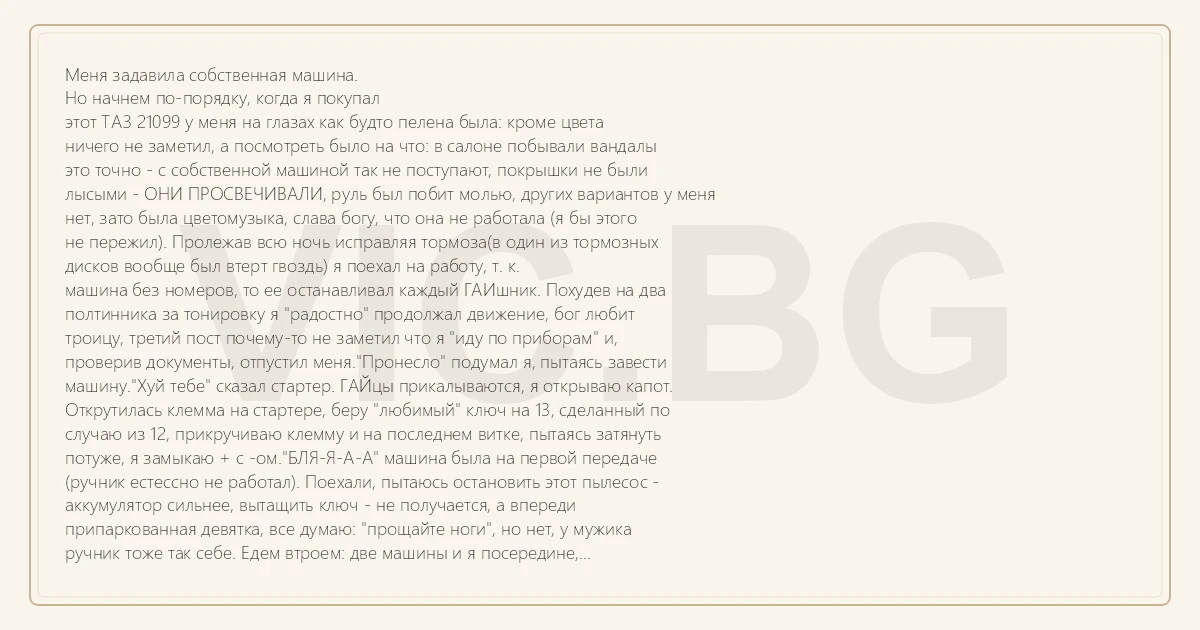 Меня задавила собственная машина. Но начнем по-порядку, когда я покупал этот ТАЗ 21099 у меня на глазах как будто пелена была: кроме цвета ничего не заметил, а посмотреть было на что: в салоне побывали вандалы это точно - с собственной машиной так не поступают, покрышки не были лысыми - ОНИ ПРОСВЕЧИВАЛИ, руль был побит молью, других вариантов у меня нет, зато была цветомузыка, слава богу, что она не работала (я бы этого не пережил). Пролежав всю ночь исправляя тормоза(в один из тормозных дисков вообще был втерт гвоздь) я поехал на работу, т. к. машина без номеров, то ее останавливал каждый ГАИшник. Похудев на два полтинника за тонировку я "радостно" продолжал движение, бог любит троицу, третий пост почему-то не заметил что я "иду по приборам" и, проверив документы, отпустил меня."Пронесло" подумал я, пытаясь завести машину."Хуй тебе" сказал стартер. ГАЙцы прикалываются, я открываю капот. Открутилась клемма на стартере, беру "любимый" ключ на 13, сделанный по случаю из 12, прикручиваю клемму и на последнем витке, пытаясь затянуть потуже, я замыкаю + с -ом."БЛЯ-Я-А-А" машина была на первой передаче (ручник естессно не работал). Поехали, пытаюсь остановить этот пылесос - аккумулятор сильнее, вытащить ключ - не получается, а впереди припаркованная девятка, все думаю: "прощайте ноги", но нет, у мужика ручник тоже так себе. Едем втроем: две машины и я посередине, героическими усилиями сдергиваю клемму с аккумулятора, автопоезд останавливается, гаишники, скорчившись, валяются на обочине, выходит водитель девятки. "Парень прости не заметил, как МОЯ МАШИНА ПОЕХАЛА НАЗАД и придавила тебе ноги." Все финиш, присоединяюсь к гаишникам. HAPPY END: через неделю я поменял ее на TOYOTA (нашлись ценители).
