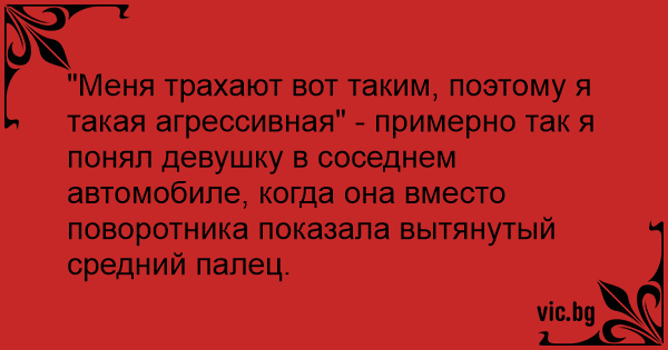 "Меня трахают вот таким, поэтому я такая агрессивная" - примерно так я понял девушку в соседнем автомобиле, когда она вместо поворотника показала вытянутый средний палец.