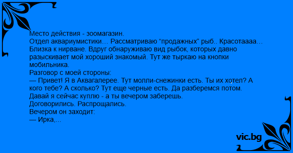 Отдел аквариумистики… Рассматриваю “продажных” рыб.. Красотаааа… Близка к нирване. Вдруг обнаруживаю вид рыбок, которых давно разыскивает мой хороший знакомый. Тут же тыркаю на кнопки мобильника.