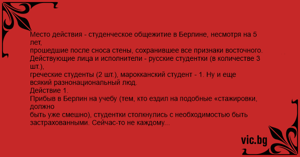 Место действия - студенческое общежитие в Берлине, несмотря на 5 лет, прошедшие после сноса стены, сохранившее все признаки восточного.