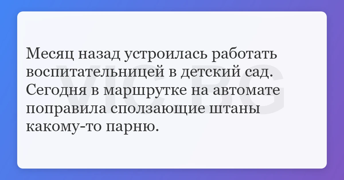 Месяц назад устроилась работать воспитательницей в детский сад. Сегодня в маршрутке на автомате поправила сползающие штаны какому-то парню.