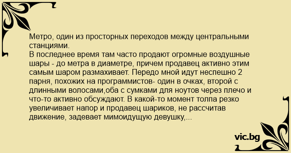 В последнее время там часто продают огромные воздушные шары - до метра в диаметре, причем продавец активно этим самым шаром размахивает. Передо мной идут неспешно 2 парня, похожих на программистов- один в очках, второй с длинными волосами,оба с сумками для ноутов через плечо и что-то активно обсуждают. В какой-то момент толпа резко увеличивает напор и продавец шариков, не рассчитав движение, задевает мимоидущую девушку, которая инстинктивно отпихивает шарик рукой. Не знаю, что у неё там на рукаве или запястье, но шарику приходит конец. Большой и очень громкий.