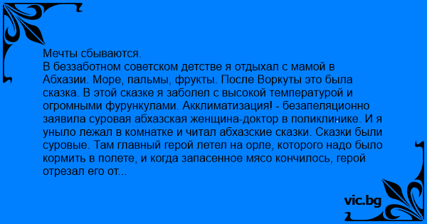 В беззаботном советском детстве я отдыхал с мамой в Абхазии. Море, пальмы, фрукты. После Воркуты это была сказка. В этой сказке я заболел с высокой температурой и огромными фурункулами. Акклиматизация! - безапеляционно заявила суровая абхазская женщина-доктор в поликлинике. И я уныло лежал в комнатке и читал абхазские сказки. Сказки были суровые. Там главный герой летел на орле, которого надо было кормить в полете, и когда запасенное мясо кончилось, герой отрезал его от своей ноги. Хозяин большого дома, в котором мы снимали комнатку, был большой веселый абхазский милиционер Сергей. У него была совсем молоденькая жена, не говорящая по русски, которую он привез с гор, чтобы держать в кулаке. Вечером все вместе смотрели во дворе по телеку итальянский детектив. Там бравые карабинеры палили из автоматов по плохим парням. "Хорошо им"-завистливо вздохнул Сергей-"а нам за каждый пистолетный патрон кучу объяснительных писать". Милиционерам тогда не давали ни автоматов ни палок. Каникулы закончились и больше я там никогда не был. Мама с новым красавцем-мужем ездила туда через пару лет. К тому времени у хозяев было двое детей и уже жена держала Сергея в кулаке, после какой-то мутной истории.