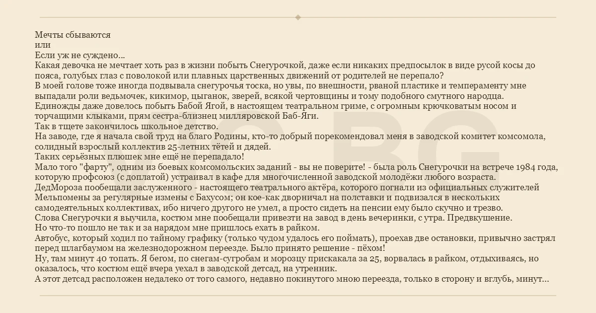 Мечты сбываются или Если уж не суждено... Какая девочка не мечтает хоть раз в жизни побыть Снегурочкой, даже если никаких предпосылок в виде русой косы до пояса, голубых глаз с поволокой или плавных царственных движений от родителей не перепало? В моей голове тоже иногда подвывала снегурочья тоска, но увы, по внешности, рваной пластике и темпераменту мне выпадали роли ведьмочек, кикимор, цыганок, зверей, всякой чертовщины и тому подобного смутного народца. Единожды даже довелось побыть Бабой Ягой, в настоящем театральном гриме, с огромным крючковатым носом и торчащими клыками, прям сестра-близнец милляровской Баб-Яги. Так в тщете закончилось школьное детство. На заводе, где я начала свой труд на благо Родины, кто-то добрый порекомендовал меня в заводской комитет комсомола, солидный взрослый коллектив 25-летних тётей и дядей. Таких серьёзных плюшек мне ещё не перепадало! Мало того "фарту", одним из боевых комсомольских заданий - вы не поверите! - была роль Снегурочки на встрече 1984 года, которую профсоюз (с доплатой) устраивал в кафе для многочисленной заводской молодёжи любого возраста. ДедМороза пообещали заслуженного - настоящего театрального актёра, которого погнали из официальных служителей Мельпомены за регулярные измены с Бахусом; он кое-как дворничал на полставки и подвизался в нескольких самодеятельных коллективах, ибо ничего другого не умел, а просто сидеть на пенсии ему было скучно и трезво. Слова Снегурочки я выучила, костюм мне пообещали привезти на завод в день вечеринки, с утра. Предвкушение. Но что-то пошло не так и за нарядом мне пришлось ехать в райком. Автобус, который ходил по тайному графику (только чудом удалось его поймать), проехав две остановки, привычно застрял перед шлагбаумом на железнодорожном переезде. Было принято решение - пёхом! Ну, там минут 40 топать. Я бегом, по снегам-сугробам и морозцу прискакала за 25, ворвалась в райком, отдыхиваясь, но оказалось, что костюм ещё вчера уехал в заводской детсад, на утренник. А этот детсад расположен недалеко от того самого, недавно покинутого мною переезда, только в сторону и вглубь, минут на 10 бега трусцой. В детсад я прибежала, немного похрипывая и поскрипывая, в горле царапало, но костюм - настоящий, васильковый, в блестках, серебряном шитье и бисере, с кокошником в жемчуге и камнях, был в моих руках. Я отправилась домой, потому что платье, хоть и было этагоднее, но надёванное, поэтому прогладить и пропарить! А домой - это опять пешком, хоть и пошатываясь, ибо лучше ползти вперёд, чем ожидать и не дождаться того причарованного буса... Дома оказалось, что я добряче хриплю и немного температурю, но это ж к вечеру пройдёт! Когда я добралась к 18:00 в кафе, оказалось, что голос мой пропал начисто, как будто его никогда не было. Я не могла выдавить из себя ни звука, ни хрипа, ни стона, ни боли... Да еще и согревающие душу 39,7°С на градуснике из кафешной аптечки будоражили мой мозг... А Дед Мороз был хорош во всех смыслах - и внешне в темно-синей бархатной шубе, расшитой звёздами, с волнистой аккуратной бородой, сверкающим посохом и поставленным басом, и внутренне — поддатый, ибо в день предновогодних вечеринок наша организация была у него далеко не первая. Нос его в гриме уже не нуждался, потому как заслуженно достиг требуемого для роли цвета. То, что я немая, его огорчило, ведь пару дней назад я 