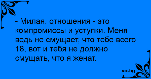 - Милая, отношения - это компромиссы и уступки. Меня ведь не смущает, что тебе всего 18, вот и тебя не должно смущать, что я женат.