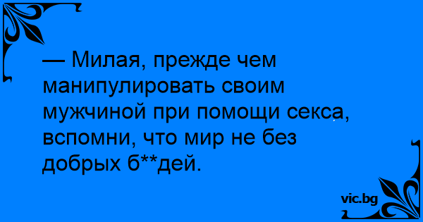 — Милая, прежде чем манипулировать своим мужчиной при помощи cекcа, вспомни, что мир не без добрых б**дей.