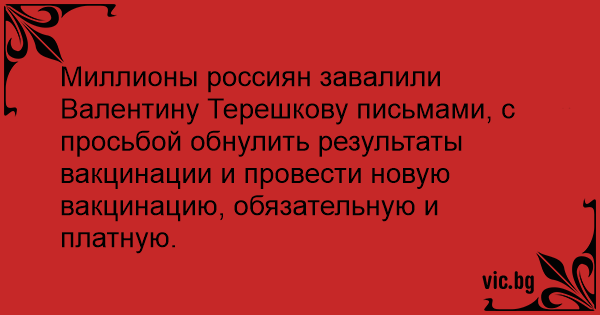 Миллионы россиян завалили Валентину Терешкову письмами, с просьбой обнулить результаты вакцинации и провести новую вакцинацию, обязательную и платную.
