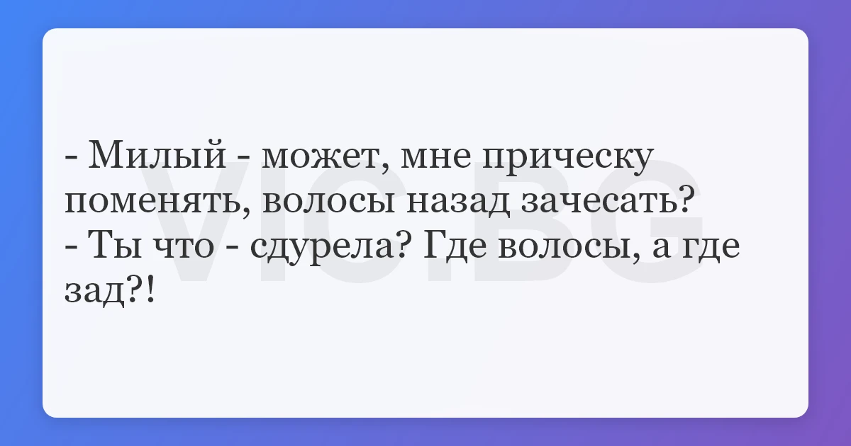 - Милый - может, мне прическу поменять, волосы назад зачесать? - Ты что - сдурела? Где волосы, а где зад?!