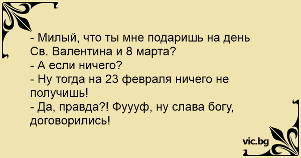 - Милый, что ты мне подаришь на день Св. Валентина и 8 марта?