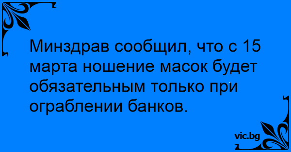 Минздрав сообщил, что с 15 марта ношение масок будет обязательным только при ограблении банков.