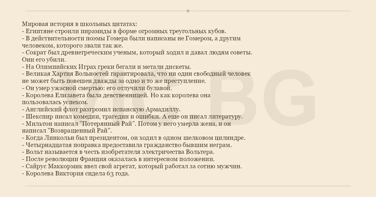 Мировая история в школьных цитатах: - Египтяне строили пирамиды в форме огромных треугольных кубов. - В действительности поэмы Гомера были написаны не Гомером, а другим человеком, которого звали так же. - Сократ был древнегреческим ученым, который ходил и давал людям советы. Они его убили. - На Олимпийских Играх греки бегали и метали дискеты. - Великая Хартия Вольностей гарантировала, что ни один свободный человек не может быть повешен дважды за одно и то же преступление. - Он умер ужасной смертью: его отлучили булавой. - Королева Елизавета была девственницей. Но как королева она пользовалась успехом. - Английский флот разгромил испанскую Армадиллу. - Шекспир писал комедии, трагедии и ошибки. А еще он писал литературу. - Мильтон написал "Потерянный Рай". Потом у него умерла жена, и он написал "Возвращенный Рай". - Когда Линкольн был президентом, он ходил в одном шелковом цилиндре. - Четырнадцатая поправка предоставила гражданство бывшим неграм. - Вольт называется в честь изобретателя электричества Вольтера. - После революции Франция оказалась в интересном положении. - Сайрус Маккормик ввел свой агрегат, который работал за сотню мужчин. - Королева Виктория сидела 63 года.