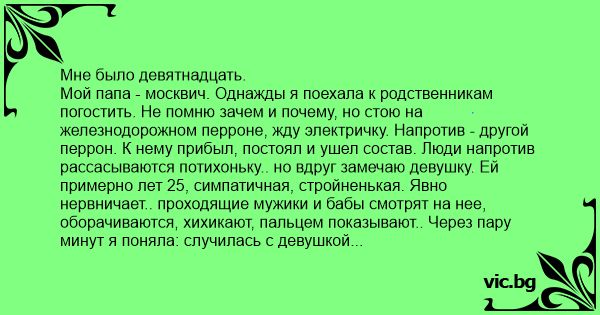 Мой папа - москвич. Однажды я поехала к родственникам погостить. Не помню зачем и почему, но стою на железнодорожном перроне, жду электричку. Напротив - другой перрон. К нему прибыл, постоял и ушел состав. Люди напротив рассасываются потихоньку.. но вдруг замечаю девушку. Ей примерно лет 25, симпатичная, стройненькая. Явно нервничает.. проходящие мужики и бабы смотрят на нее, оборачиваются, хихикают, пальцем показывают.. Через пару минут я поняла: случилась с девушкой неприятность. Видимо, в дороге, неожиданно случились у нее женские дни. Испачкала она свою светлую юбочку. Компания молодых людей, вообще, ее обсвистала... Девушка вся сконфузилась, сжалась, скукожилась... прижалась к столбу и плачет. Вдруг, к ней подходит парень... На вид - лет 17-18, не более... Я подумала: "Ну, еще один козел!" Решила подойти к ней ... хотя бы заступиться...