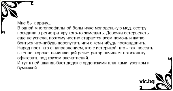 И тут к ней шкандыбает дедок с орденскими планками, узелком и бумажкой (как позже выяснилось - направлением на госпитализацию в урологическое отделение на предмет удаления аденомы простаты). Дед сует бумажку в окошко: